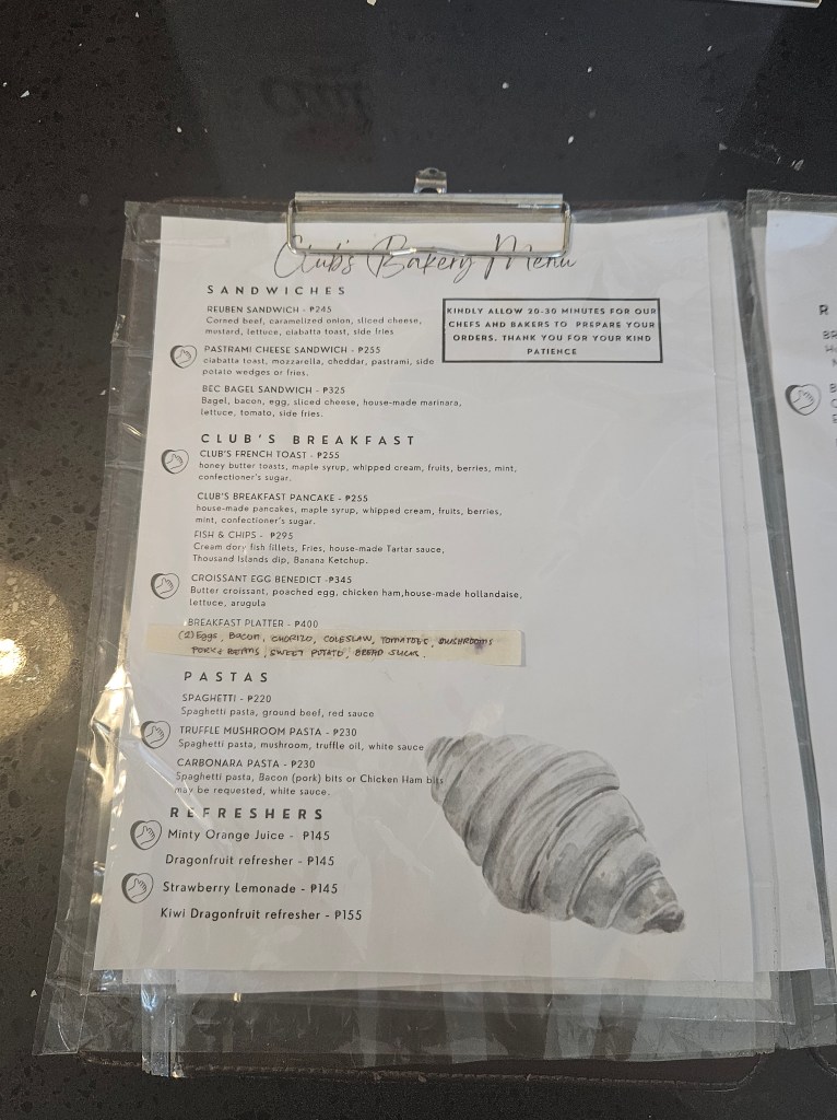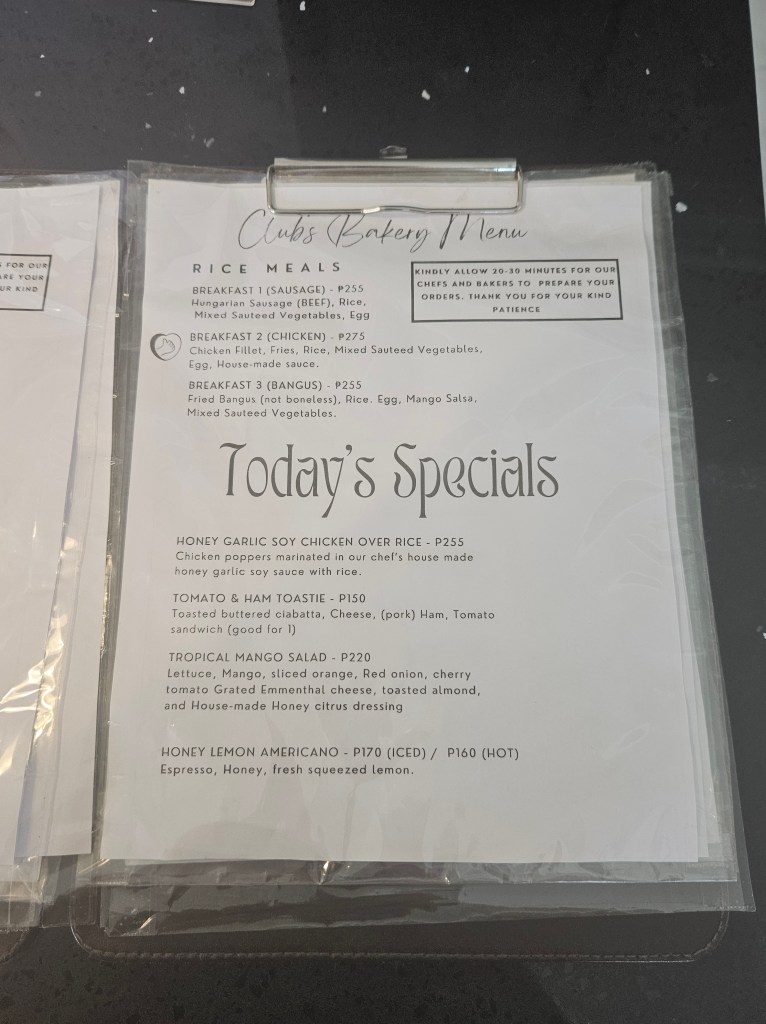 Club’s Bakery as the name implies is a store focused on bread, but they do offer a selection of food apart from it. They only have a few selection but provide a good selection. They offer sandwiches which made use of their croissants, ciabattas, and bagels. Sandwich price range can cost around P245 to P325.