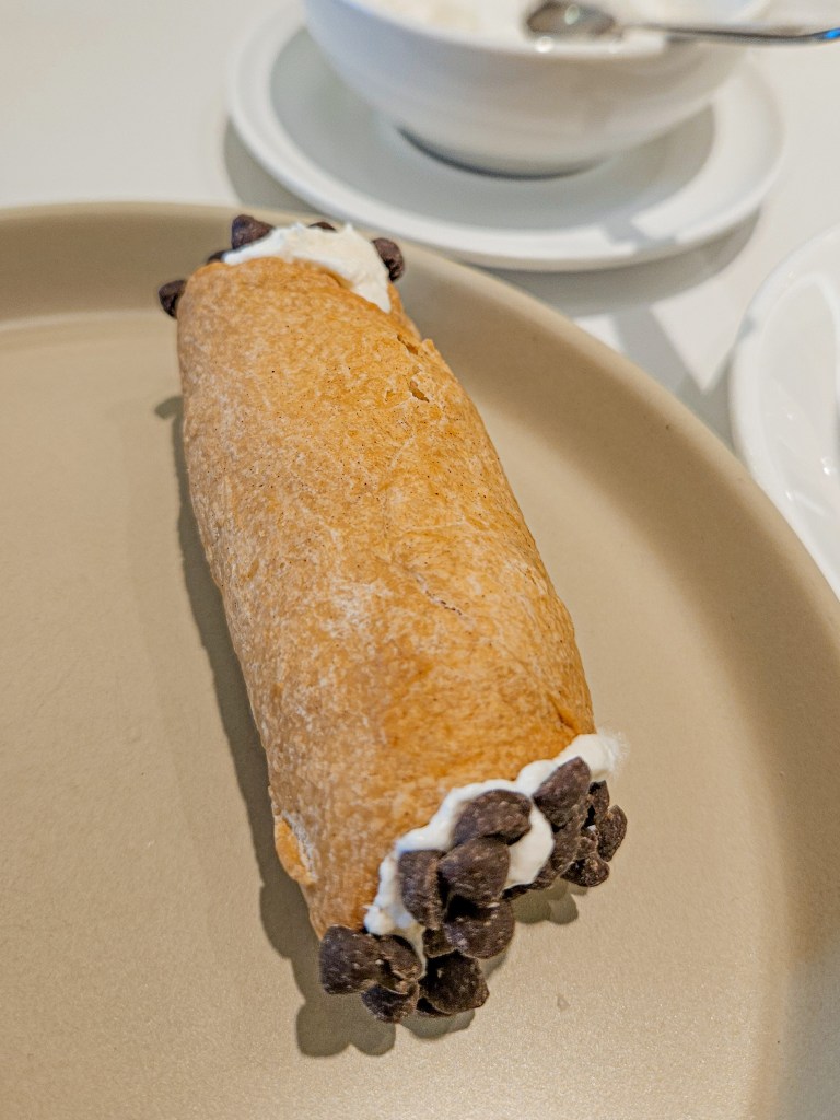 Cannoli is an Italian classic which is a crispy fried dough shaped into a tube and filled with a sweet cheesy filling. While I’m not entirely sure of their exact recipe, I’m guessing it’s a blend of cream cheese, giving it a unique savory-sweet flavor. The addition of chocolate enhances the sweetness, providing a deeper, more complex taste. The dough itself has a pleasantly thick yet crumbly texture reminding me of a cornetto cone. Though not all tasting like a cornetto cone but that is the most similar taste I can associate it with. It is more buttery than a cornetto cone. Not only is it good and reasonably priced, but it’s also a light dessert that’s not too filling which makes it a great finish. (Priced not on Menu, but at Store)