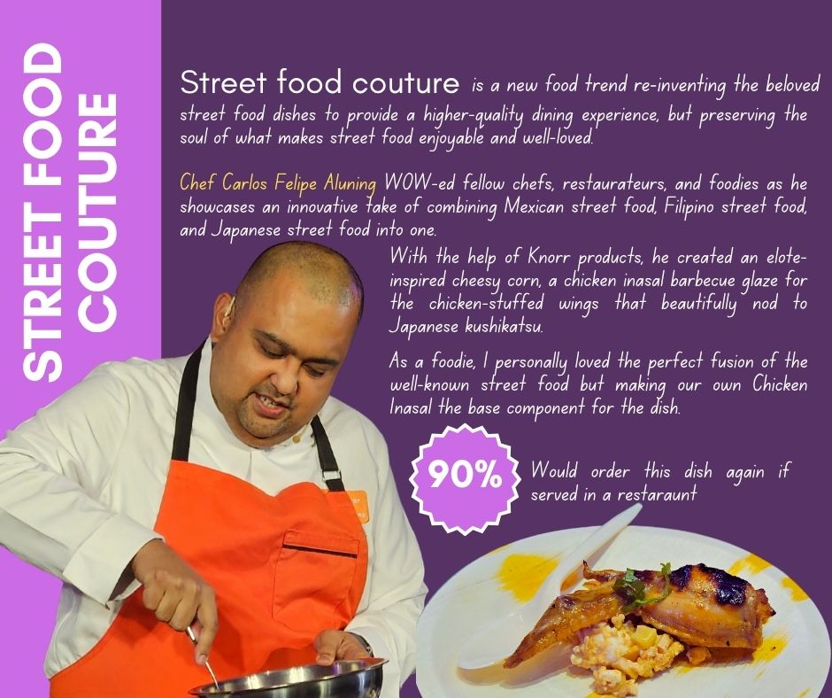 Chef Carlos Felipe Aluning showcased his culinary skills as he prepared an elevated version of a celebrated Filipino street food – the grilled inasal chicken. As he prepares the dish, he walks us through the Street Food Couture concept. Each country has its own distinct street food culture, and the new trend is elevating this experience and adding these as a dish to your menu. As he presents this concept, he wows the audience as he creates an inasal barbecue sauce, lathers it on a deboned chicken wing, which he stuffed with a delicious ground pork mixture. He made a mountain of elote-inspired cheesy corn as a base and placed the grilled chicken wing on top. The dish is a culmination of three street food dishes across different countries: Mexican Elote, Filipino Inasal, and Japanese Kushikatsu. Street Food Couture refines street food favorites. If served in a restaurant, I would be 90% drawn to order this.