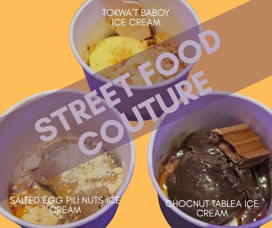Part of the street food couture was the experience of trying three new ice cream flavors that are proudly Filipino. They wheeled out the famous Filipino “dirty ice cream” cart and served Tokwa’t Baboy, Chocnut Tablea, and Salted Egg Pili Nut Ice Cream. I tried three of these flavors and would be 100% drawn to order this out of curiosity when served in a restaurant.