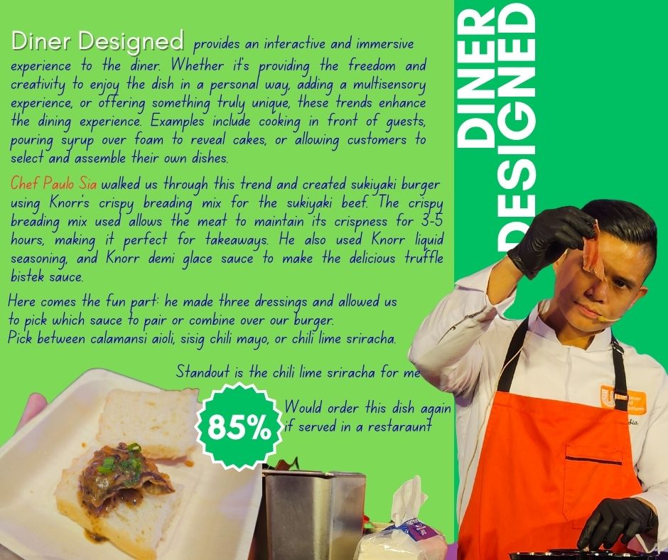 Diner Designed is a trend concept that allows diners to be involved. It lets your plate become the canvas and the dish your palette and paintbrush. The limit? Your creativity. This is what Chef Paulo Sia explained with the new trend. This allows a more immersive and interactive experience in dining. This includes build-your-own dishes, live cooking, and adding some sort of spectacle and entertainment to your dish. While discussing, he prepared an amazing deep-fried sukiyaki burger that had a truffle bistek sauce as demi-glace. The sukiyaki had a very similar texture to a chicken fillet. For dressing, he provides three options to pick from: calamansi aioli, sisig chili mayo, and chili lime sriracha. A lot were drawn to the chili lime sriracha, having some spiciness to it, including me. If served in a restaurant, I would 85% order this dish. However, the bistek sauce as a burger sauce is an amazing idea that I will replicate at home.