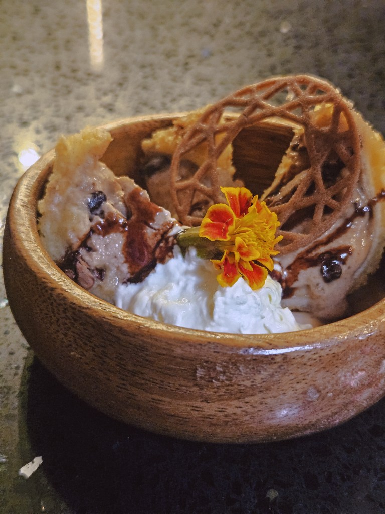 Ikao’s Turon Salted De Cacao is a modern reinterpretation of Filipino’s favorite afternoon snack. This introduces an atypical companion – their homemade cacao icecream. A lighter and easy to the palate rendition of Filipino turon where it uses paper-thin rice wrapper, fried to a perfect crisp, lightly salted, but removing the identity of the sweet and stickiness of turon. While the traditional turon is a guilty treat, this one is a much lighter and healthier version. It has a paler golden hue than the traditional street-side turon. It also removed the element of jackfruit, but where it lacks the sweetness from the jackfruit, it compensates with the sweetness and decadence of their homemade cacao ice cream. Together, it would be an easy favorite for those who enjoy a much lighter and less sweet treat.