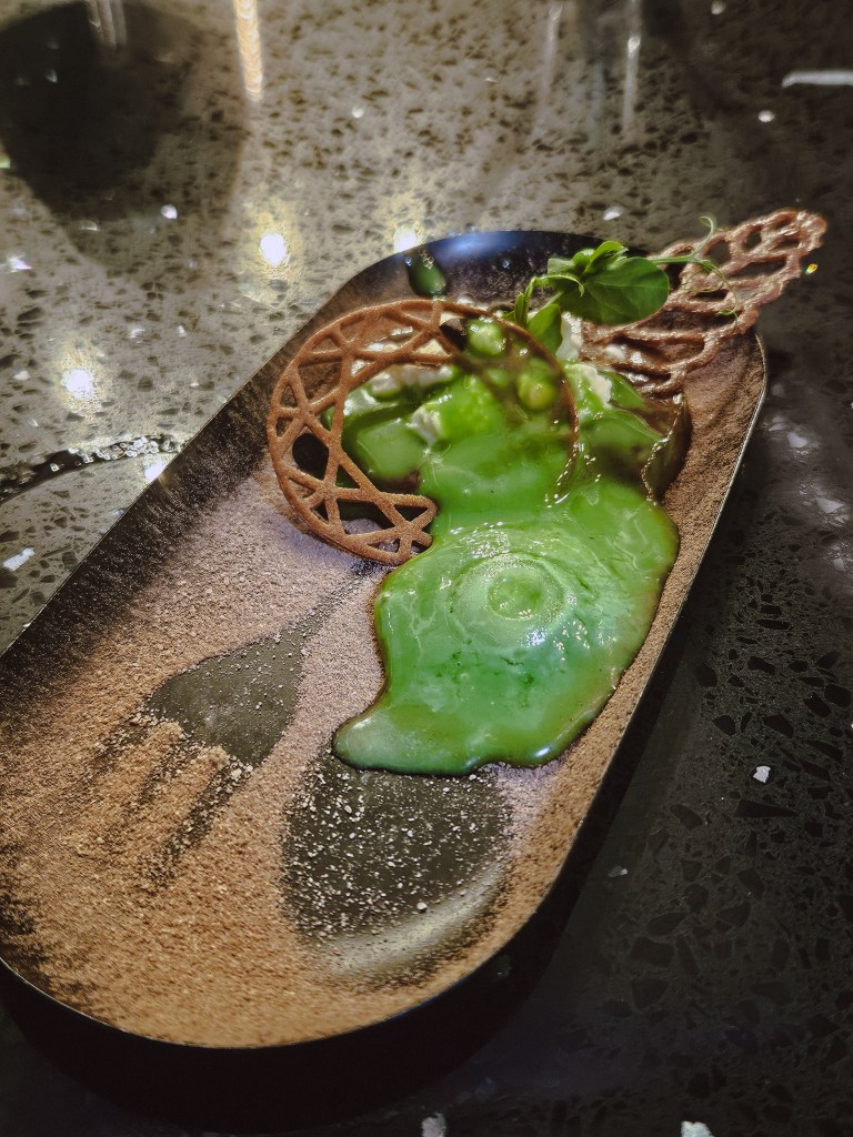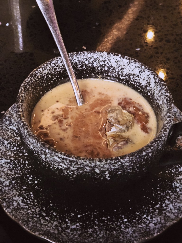 The Fireball Champorado stands as the most interactive dish among all the feature creation. It is a captivating experience in both its visuality and palatability. Despite its simplicity in its design and ingredients, it delivers a performance that demands to be seen. Inspired from the classic champorado, the dish features the typical rice porridge made out of tablea mixture, with danggit na bulad as a counterbalance to its sweetness. What makes it different is that it adds rum to the dish. A small shot of burning mixture is prepared then poured over the champorado. This technique kills the alcohol but never truly removes the depth and bitterness of the rum. This then adds a layer of complexity to the well-loved champorado dish.