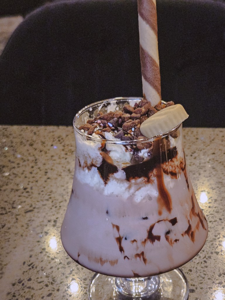 Cacao Cheesecake frappe is a playful and rich drink made perfectly for kids or kids at heart. Atop the drink sits a thick, luscious cloud of cream cheese whipped cream, dusted with crunchy cacao nib and chocolate bits that adds a chunky texture with each sip. It doesn’t shy from how playful this drink is at is crowned with a stick-o biscuit and a white chocolate button that makes it visually cute. Once you slurp and reach the bottom of the luscious cloud whipped cream, your taste bud tastes the rich chocolate milk layer. Creamy, milky yet has a very defined flavor of the chocolate.